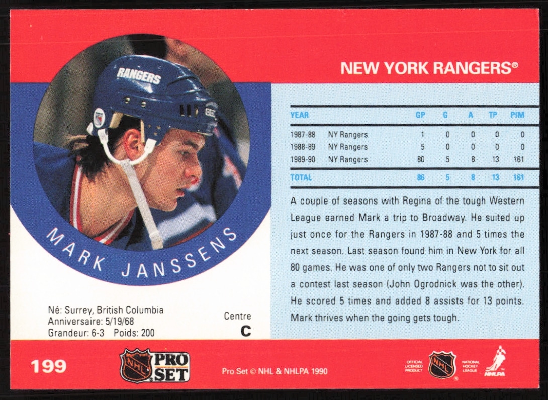 This Hockey card, from 1990-91 is part of the Pro Set NHL card set. Mark Janssens is featured and has a card number of 199.