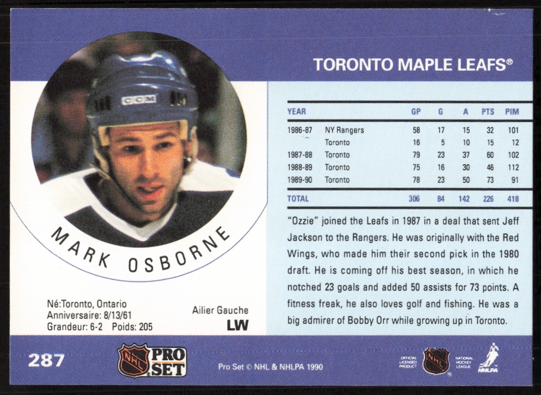 This Hockey card, from 1990-91 is part of the Pro Set NHL card set. Mark Osborne is featured and has a card number of 287.