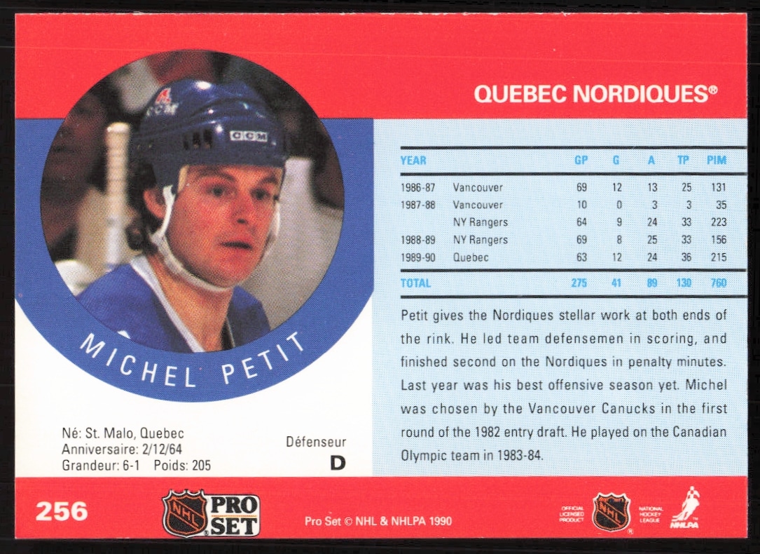 This Hockey card, from 1990-91 is part of the Pro Set NHL card set. Michel Petit is featured and has a card number of 256.