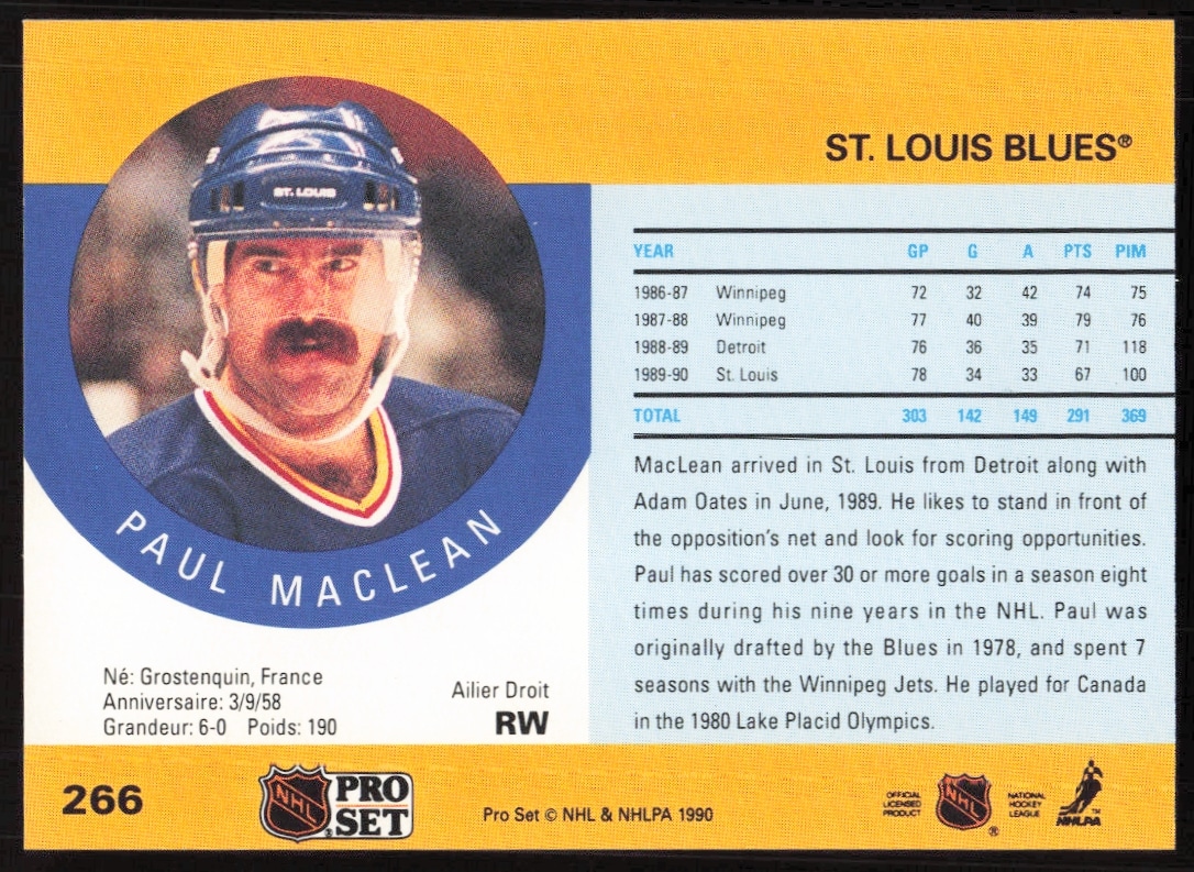 This Hockey card, from 1990-91 is part of the Pro Set NHL card set. Paul MacLean is featured and has a card number of 266.