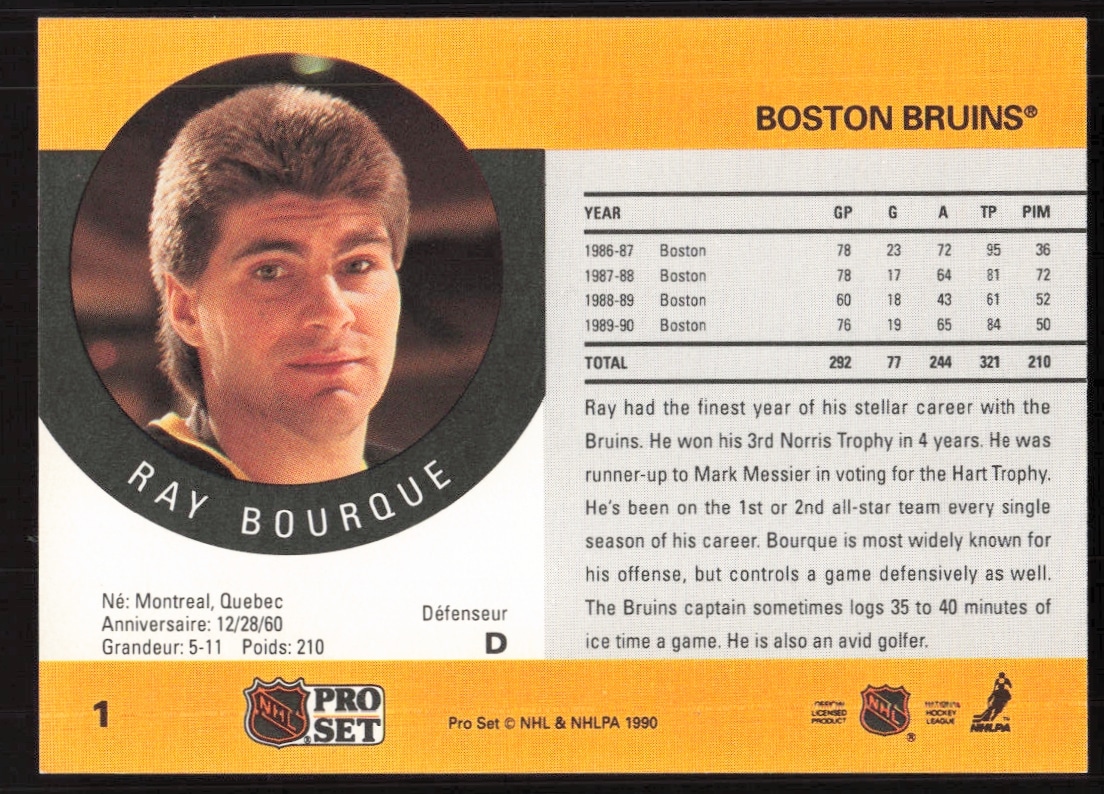 This Hockey card, from 1990-91 is part of the Pro Set NHL card set. Ray Bourque is featured and has a card number of 1.