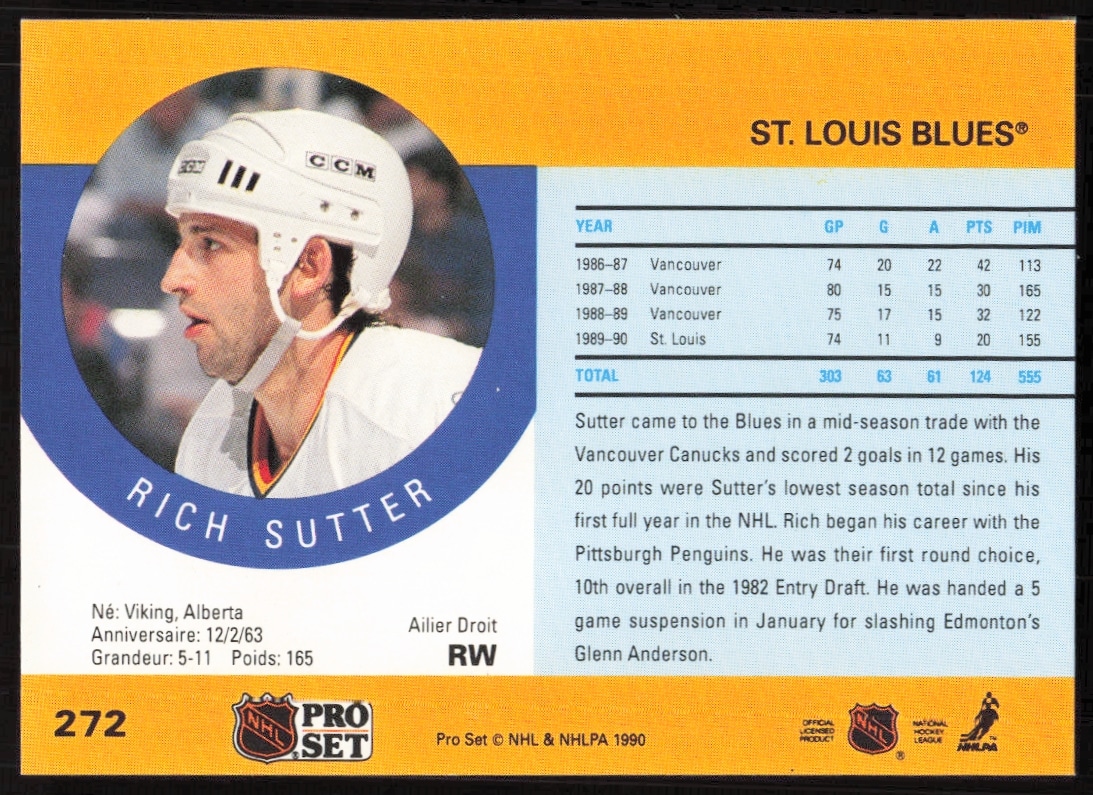 This Hockey card, from 1990-91 is part of the Pro Set NHL card set. Rich Sutter is featured and has a card number of 272.