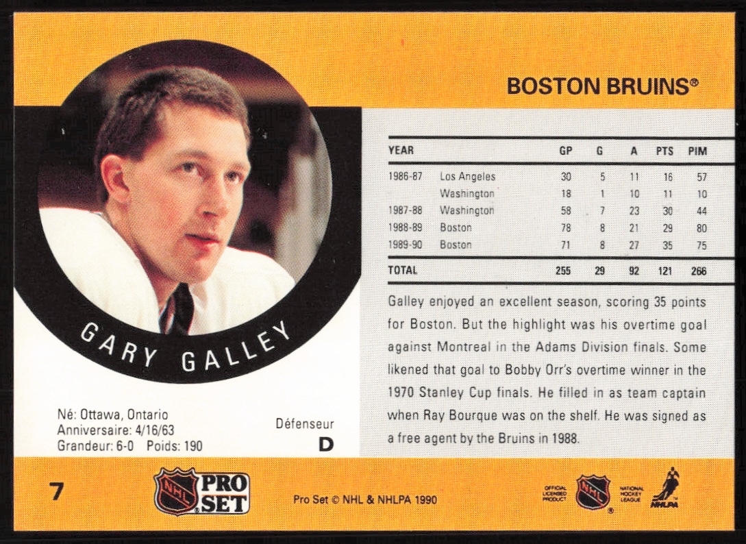 This Hockey card, from 1990-91 is part of the Pro Set card set. Garry Galley is featured and has a card number of 7.