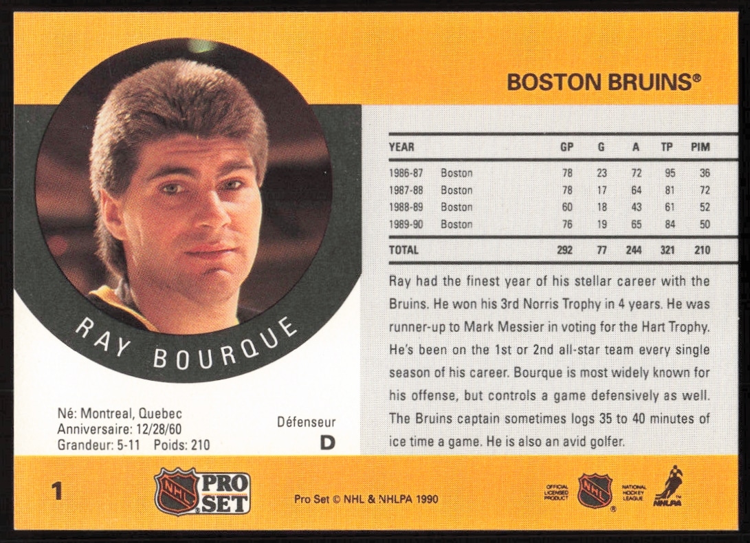 This Hockey card, from 1990-91 is part of the Pro Set card set. Ray Bourque is featured and has a card number of 1.