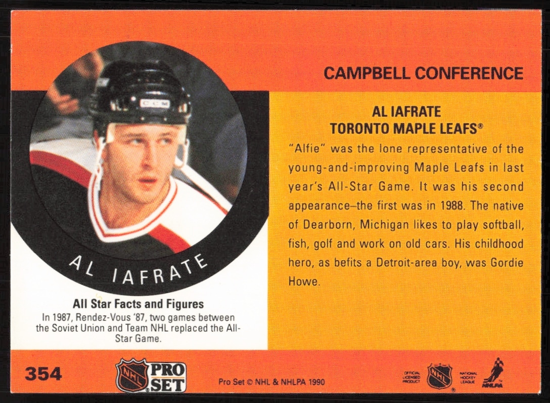 This Hockey card, from 1990-91 is part of the Pro Set NHL card set. Al Iafrate is featured and has a card number of 354.