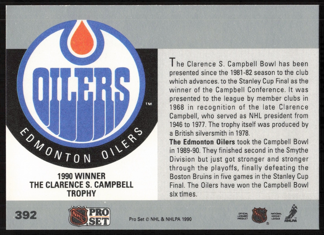 This Hockey card, from 1990-91 is part of the Pro Set NHL card set. Clarence S. Campbell Trophy AW, UER is featured and has a card number of 392.