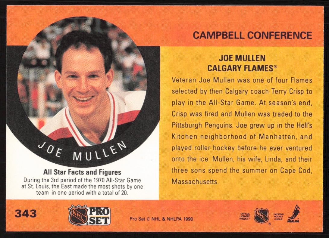 This Hockey card, from 1990-91 is part of the Pro Set NHL card set. Joe Mullen is featured and has a card number of 343.