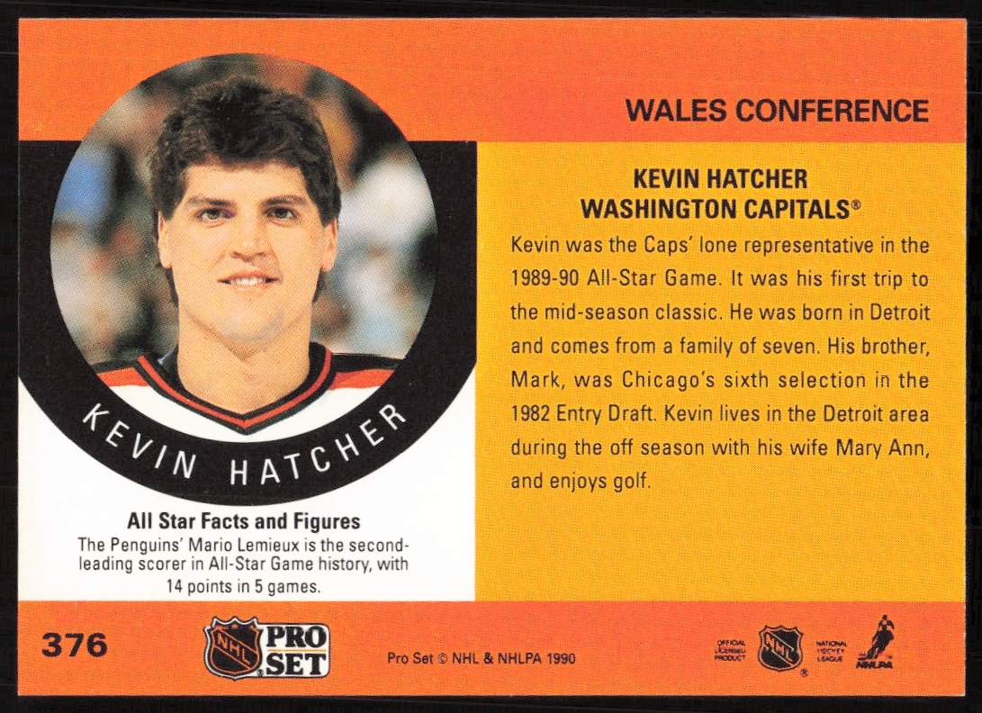 This Hockey card, from 1990-91 is part of the Pro Set NHL card set. Kevin Hatcher is featured and has a card number of 376.