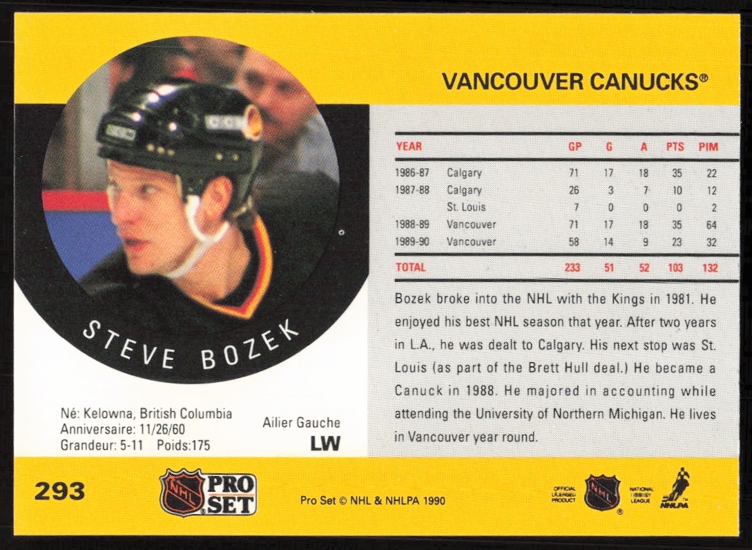 This Hockey card, from 1990-91 is part of the Pro Set NHL card set. Steve Bozek is featured and has a card number of 293.