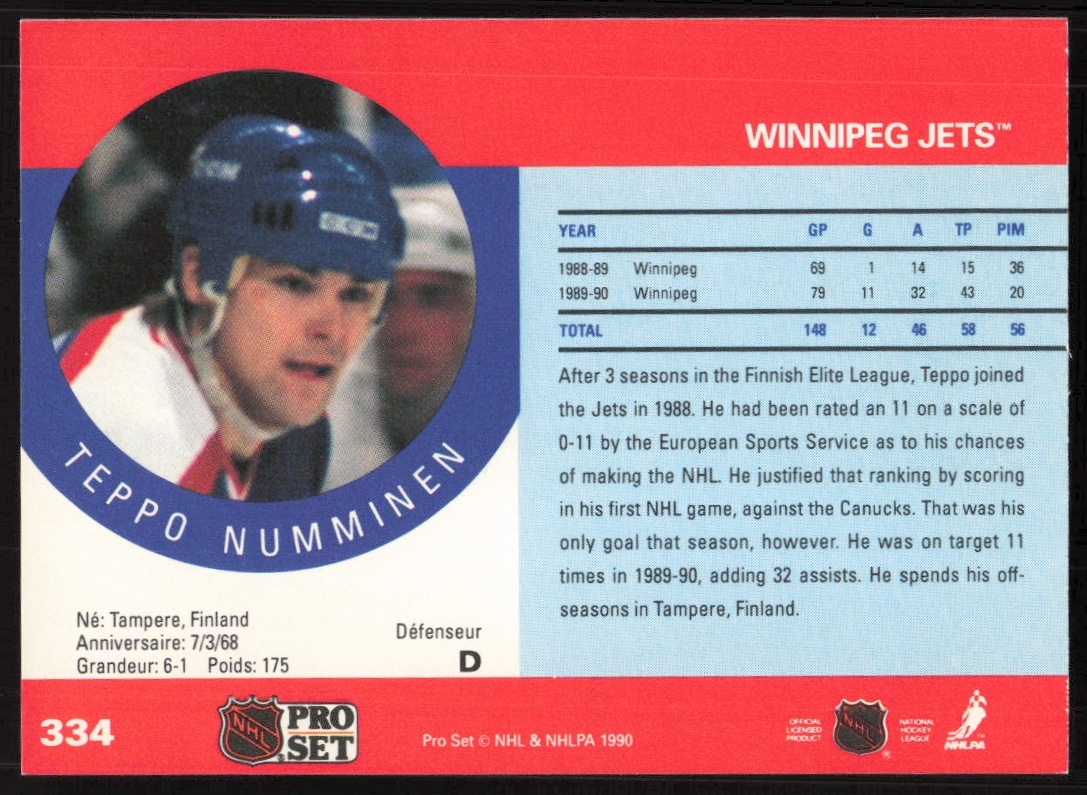This Hockey card, from 1990-91 is part of the Pro Set NHL card set. Teppo Numminen is featured and has a card number of 334.