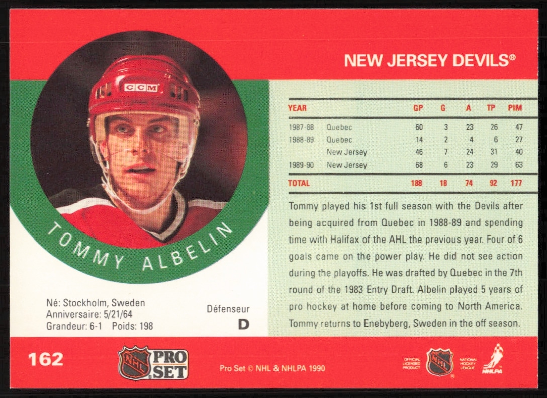 This Hockey card, from 1990-91 is part of the Pro Set NHL card set. Tommy Albelin is featured and has a card number of 162.