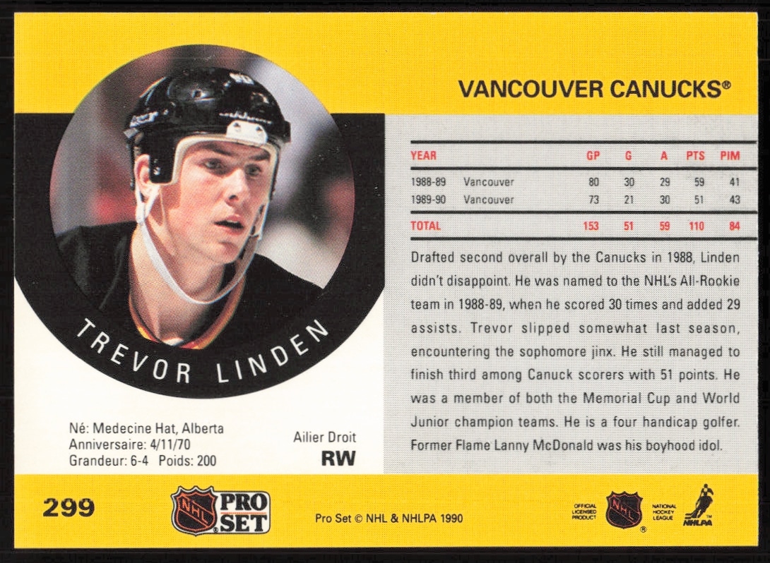This Hockey card, from 1990-91 is part of the Pro Set NHL card set. Trevor Linden is featured and has a card number of 299.