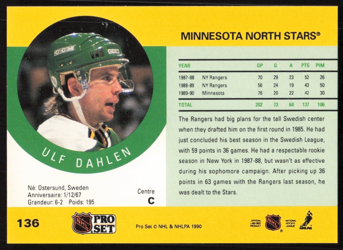 This Hockey card, from 1990-91 is part of the Pro Set NHL card set. Ulf Dahlen is featured and has a card number of 136.