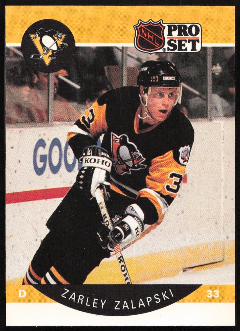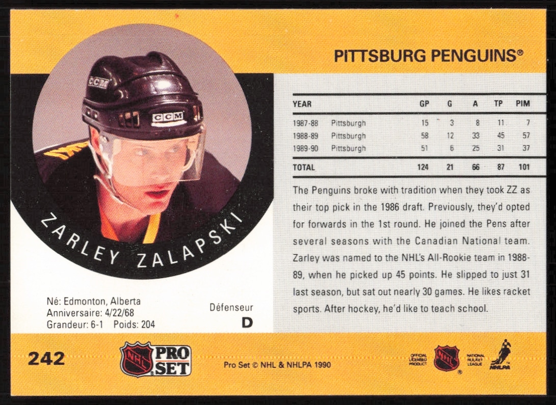 This Hockey card, from 1990-91 is part of the Pro Set NHL card set. Zarley Zalapski is featured and has a card number of 242.