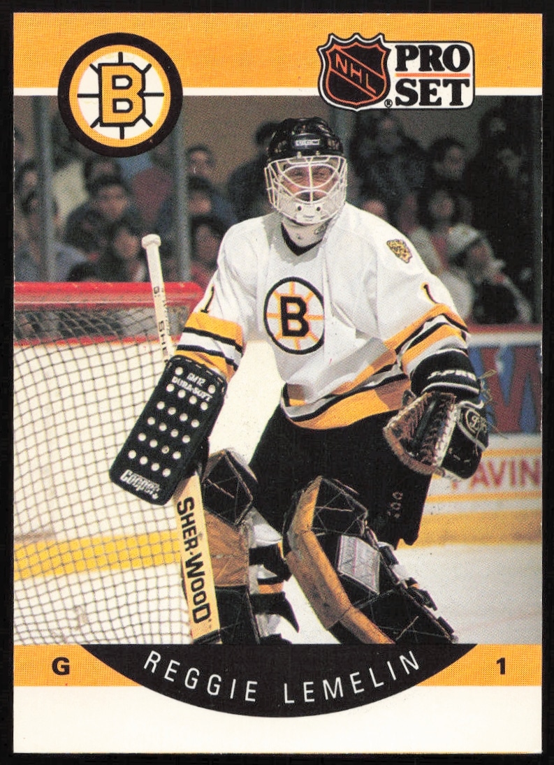 This Hockey card, from 1990-91 is part of the Pro Set card set. Reggie Lemelin is featured and has a card number of 9.