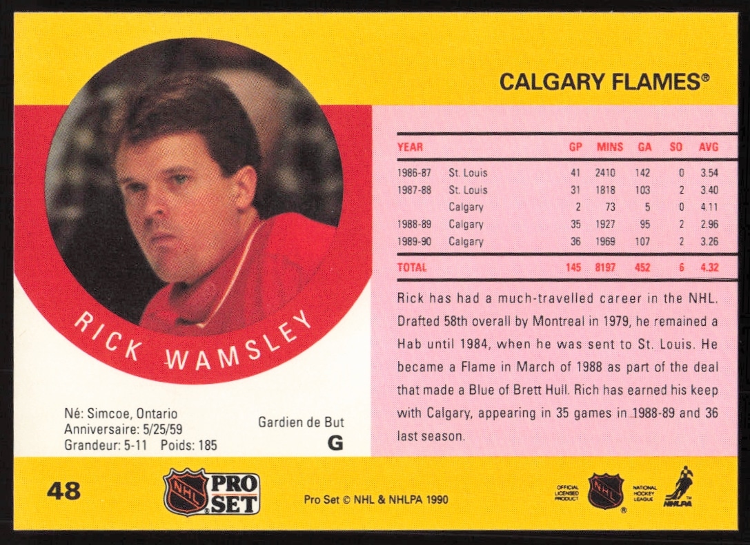 This Hockey card, from 1990-91 is part of the Pro Set card set. Rick Wamsley is featured and has a card number of 48.