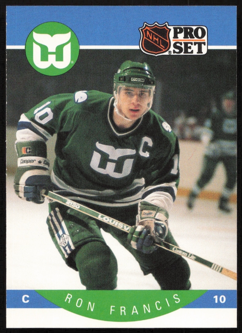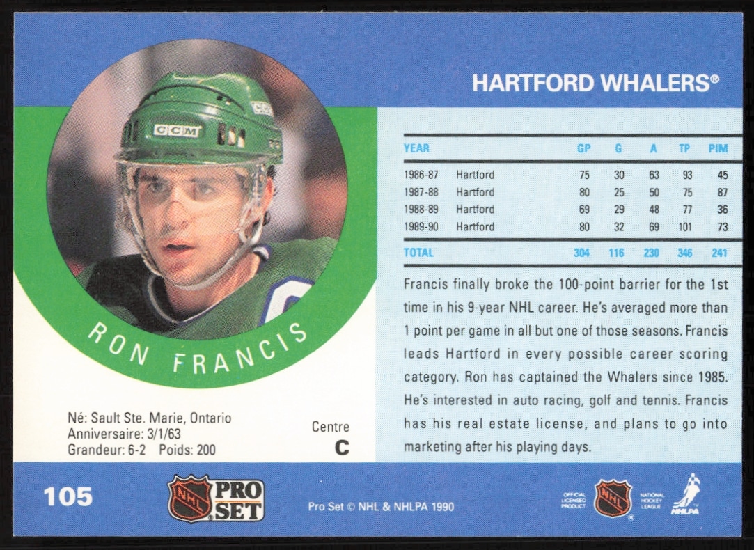 This Hockey card, from 1990-91 is part of the Pro Set card set. Ron Francis is featured and has a card number of 105.