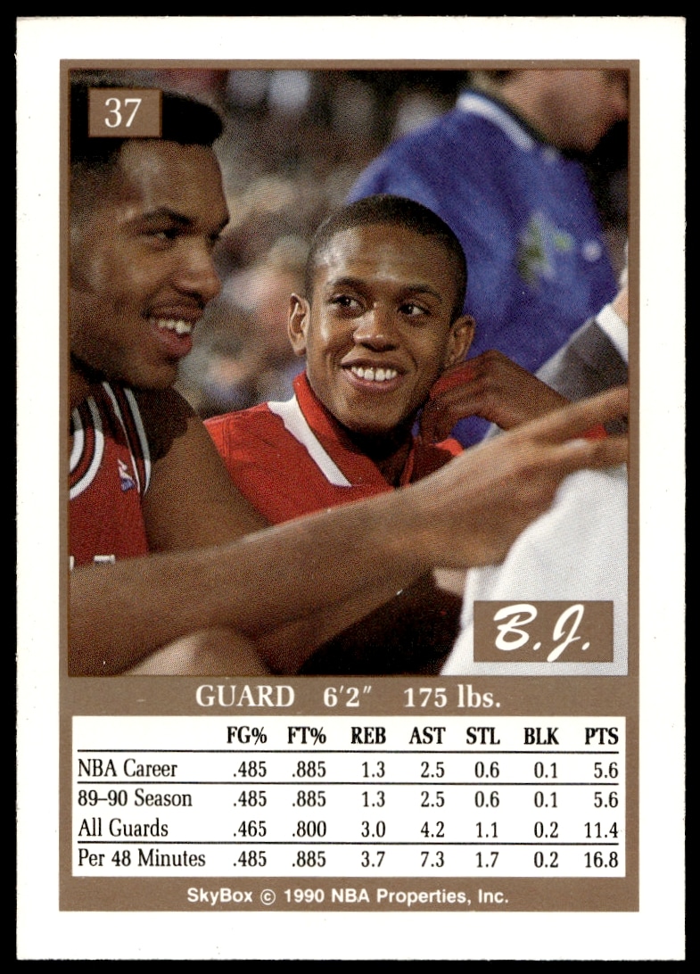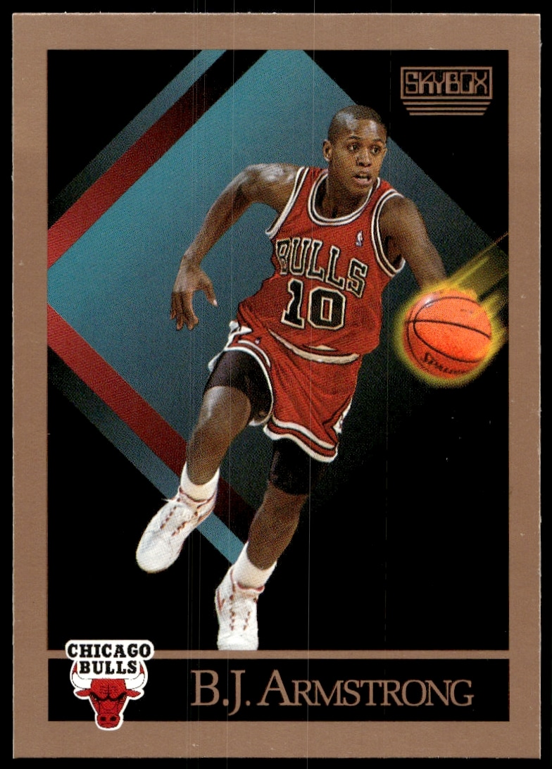 This Basketball card, from 1990-91 is part of the SkyBox card set. B.J. Armstrong is featured and has a card number of 37.