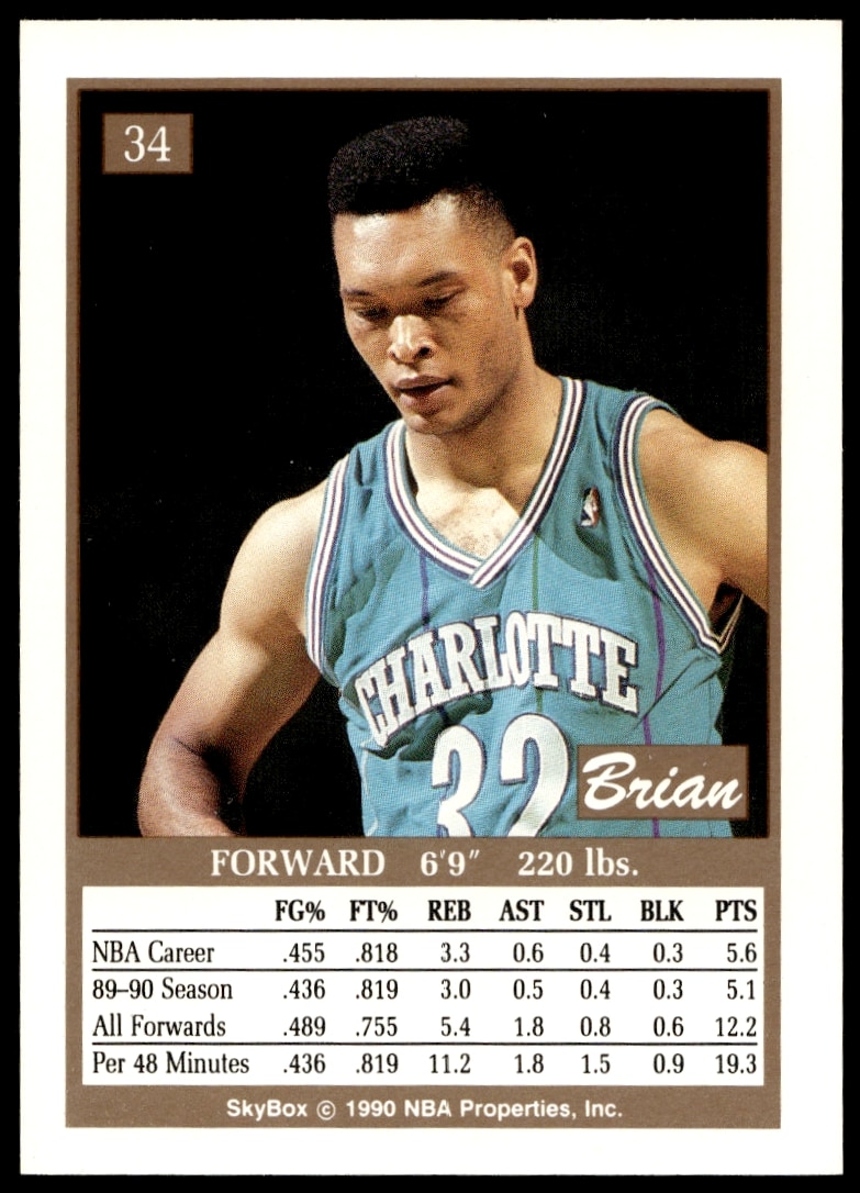 This Basketball card, from 1990-91 is part of the SkyBox card set. Brian Rowsom is featured and has a card number of 34.
