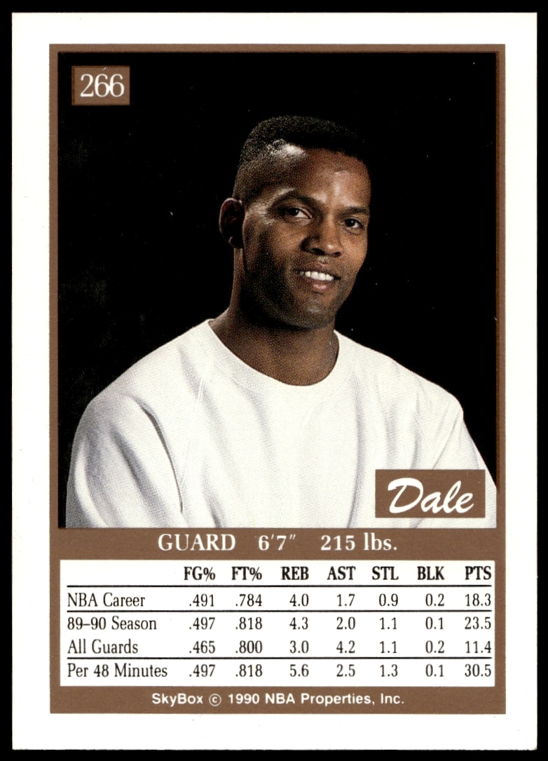 This Basketball card, from 1990-91 is part of the SkyBox card set. Dale Ellis is featured and has a card number of 266.