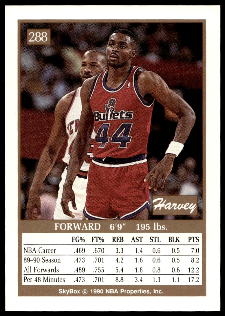 This Basketball card, from 1990-91 is part of the SkyBox card set. Harvey Grant is featured and has a card number of 288.
