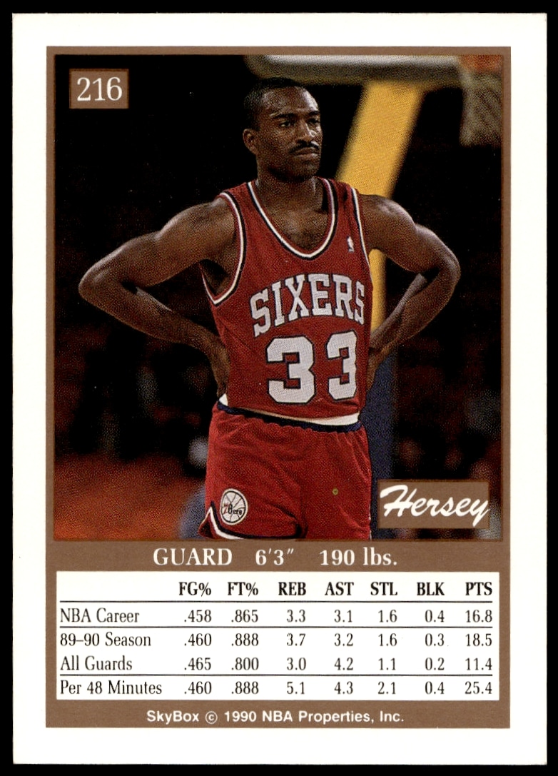 This Basketball card, from 1990-91 is part of the SkyBox card set. Hersey Hawkins is featured and has a card number of 216.