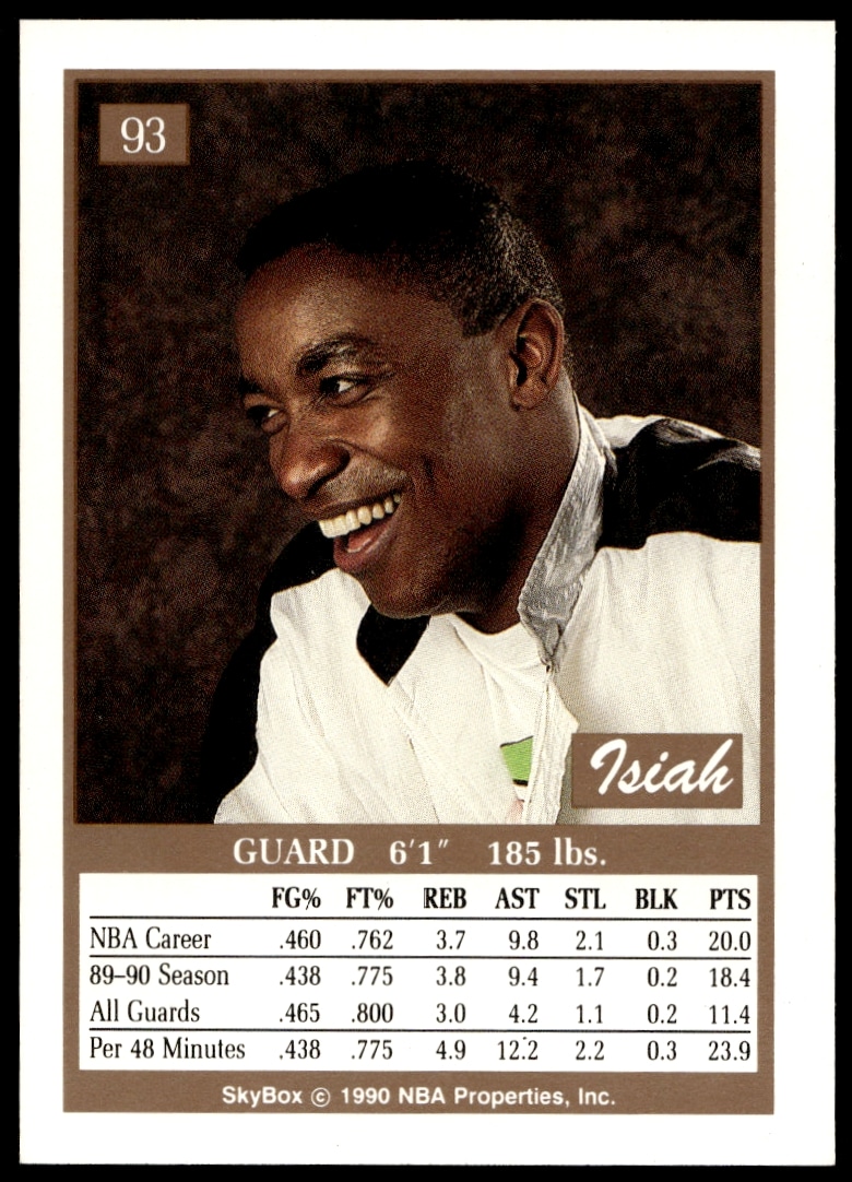 This Basketball card, from 1990-91 is part of the SkyBox card set. Isiah Thomas is featured and has a card number of 93.