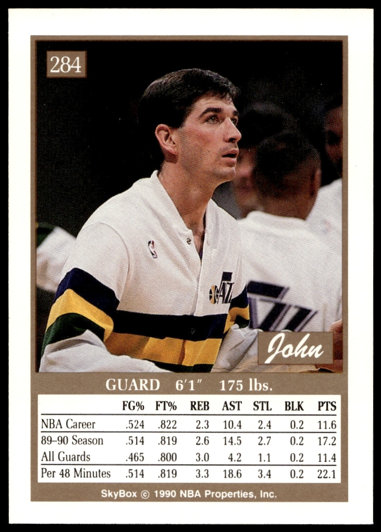 This Basketball card, from 1990-91 is part of the SkyBox card set. John Stockton is featured and has a card number of 284.