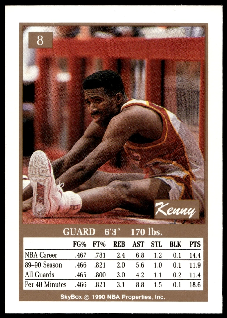 This Basketball card, from 1990-91 is part of the SkyBox card set. Kenny Smith is featured and has a card number of 8.