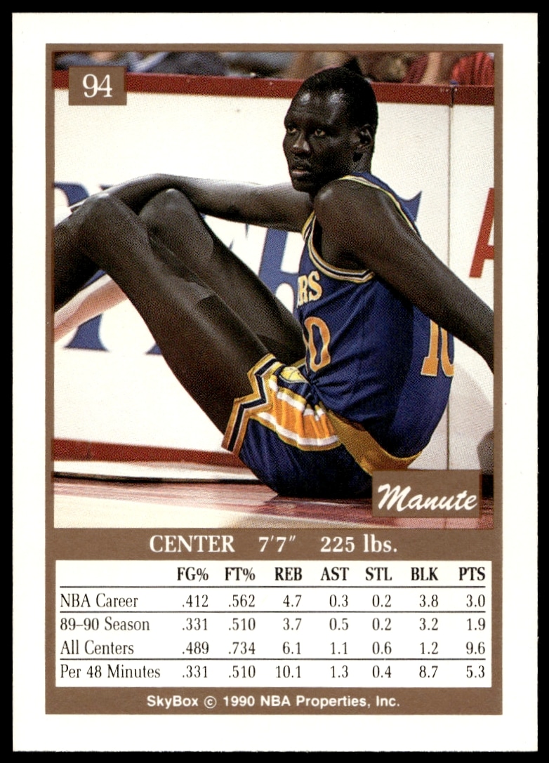 This Basketball card, from 1990-91 is part of the SkyBox card set. Manute Bol is featured and has a card number of 94.