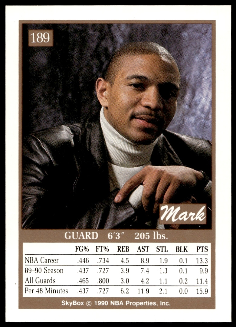 This Basketball card, from 1990-91 is part of the SkyBox card set. Mark Jackson is featured and has a card number of 189.