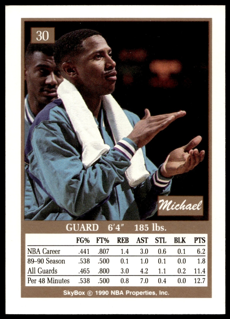This Basketball card, from 1990-91 is part of the SkyBox card set. Michael Holton is featured and has a card number of 30.