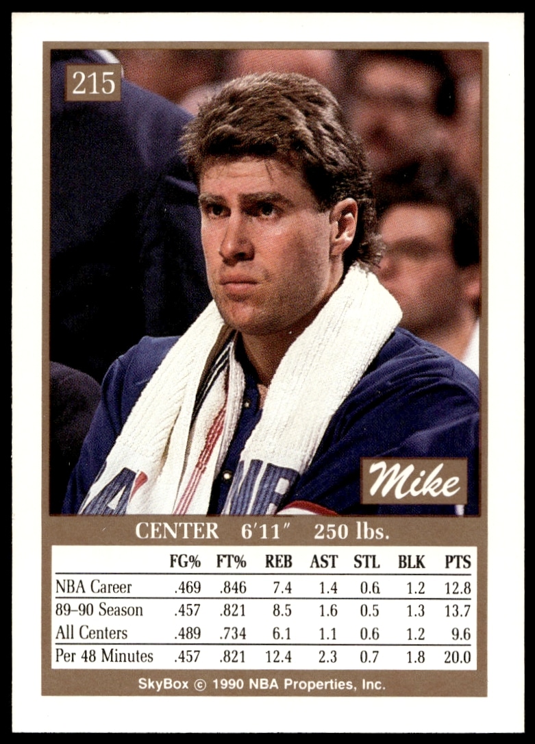 This Basketball card, from 1990-91 is part of the SkyBox card set. Mike Gminski is featured and has a card number of 215.