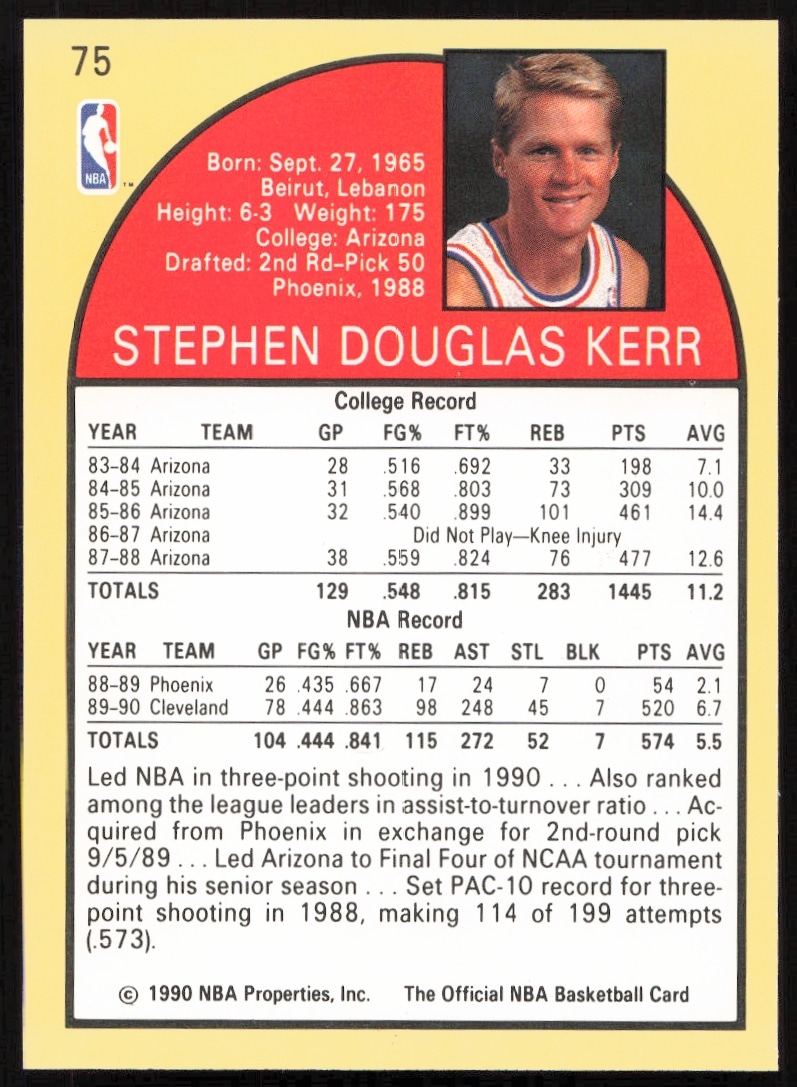 This Basketball card, from 1990-91 is part of the Hoops card set. Steve Kerr is featured and has a card number of 75.