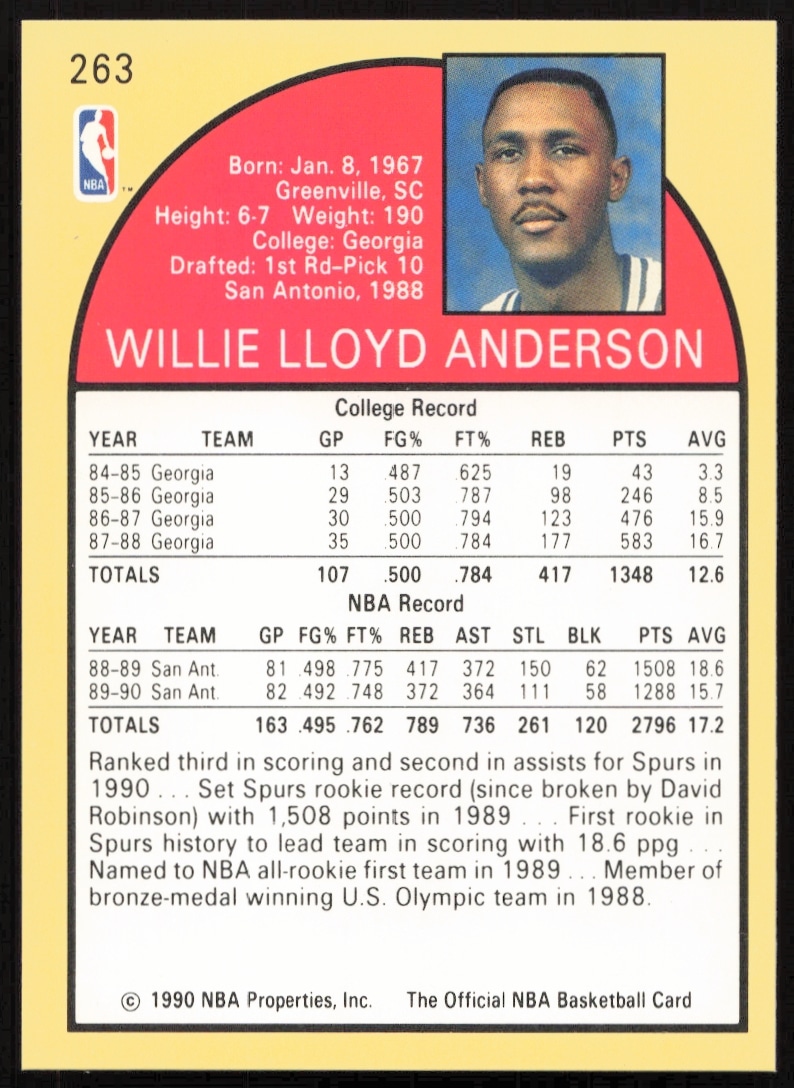 This Basketball card, from 1990-91 is part of the Hoops card set. Willie Anderson is featured and has a card number of 86.