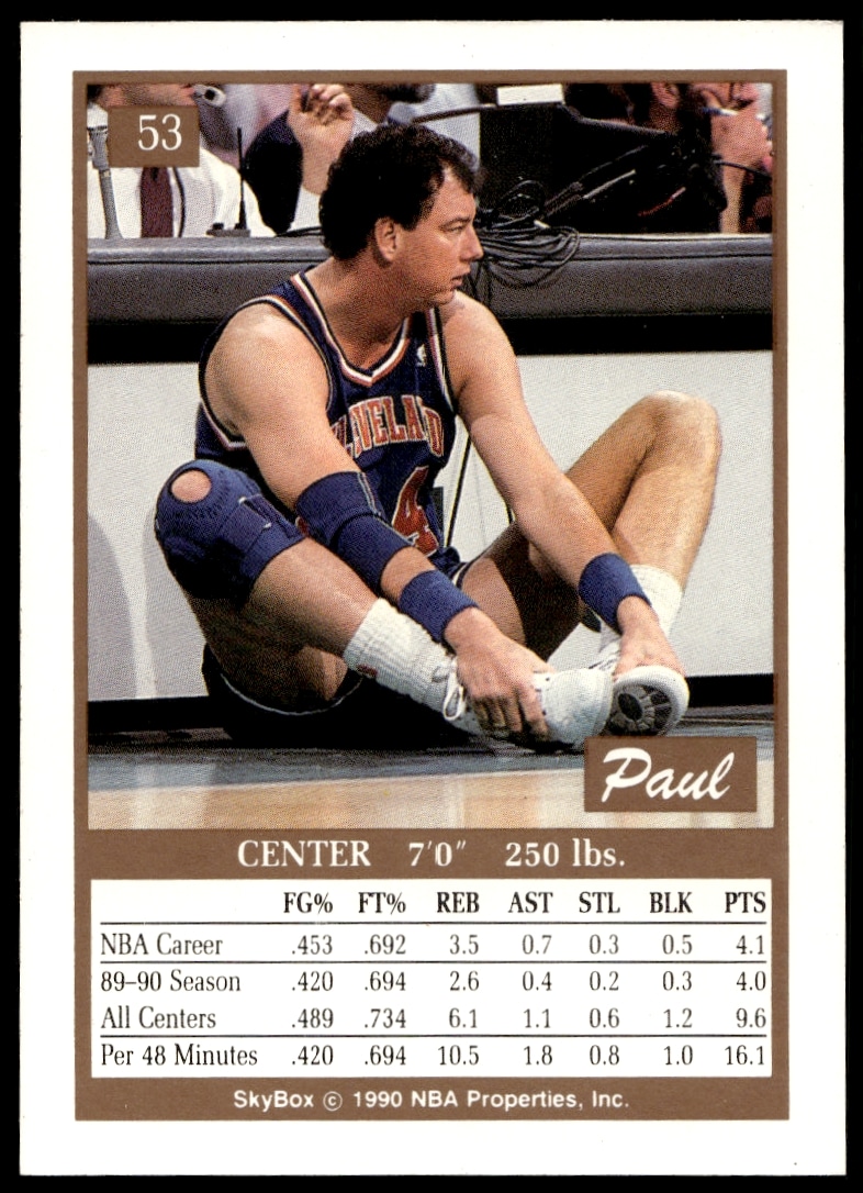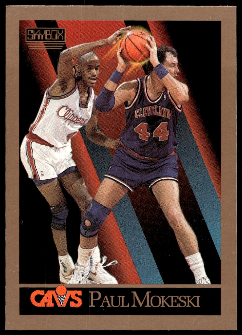 This Basketball card, from 1990-91 is part of the SkyBox card set. Paul Mokeski is featured and has a card number of 53.