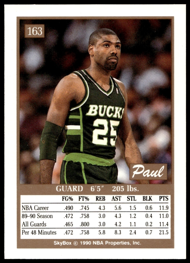 This Basketball card, from 1990-91 is part of the SkyBox card set. Paul Pressey is featured and has a card number of 163.