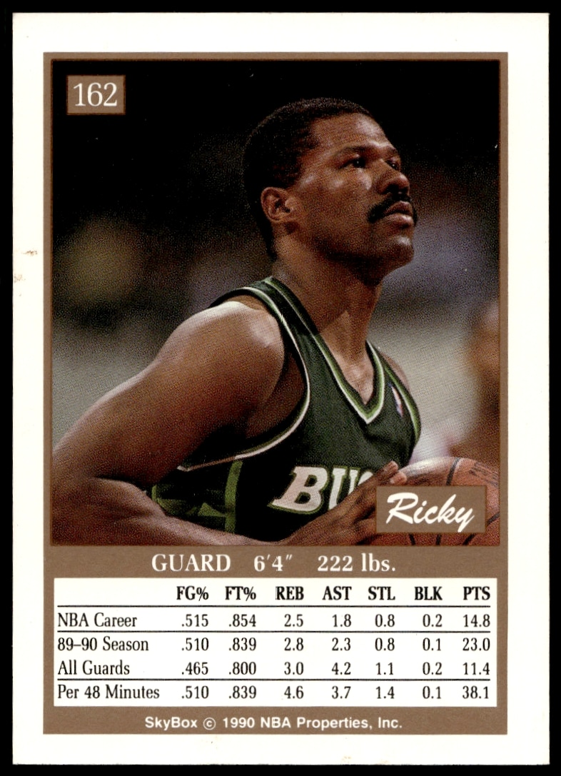 This Basketball card, from 1990-91 is part of the SkyBox card set. Ricky Pierce is featured and has a card number of 162.
