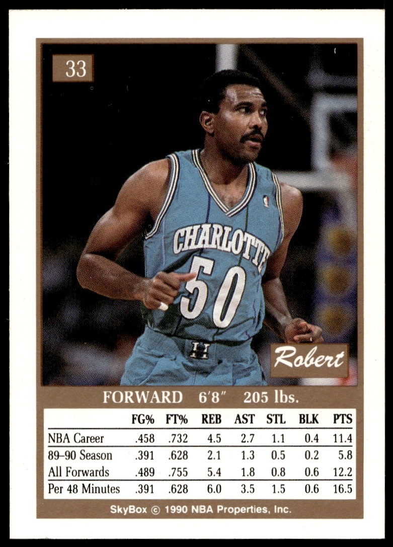 This Basketball card, from 1990-91 is part of the SkyBox card set. Robert Reid is featured and has a card number of 33.