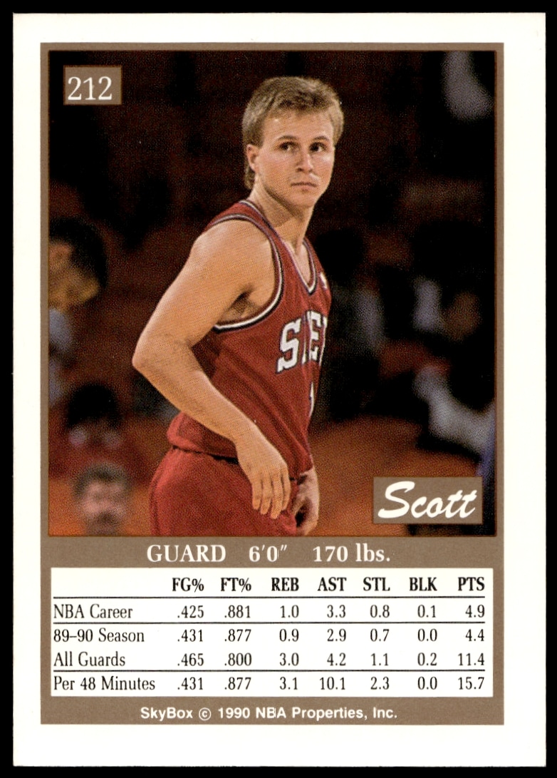 This Basketball card, from 1990-91 is part of the SkyBox card set. Scott Brooks is featured and has a card number of 212.