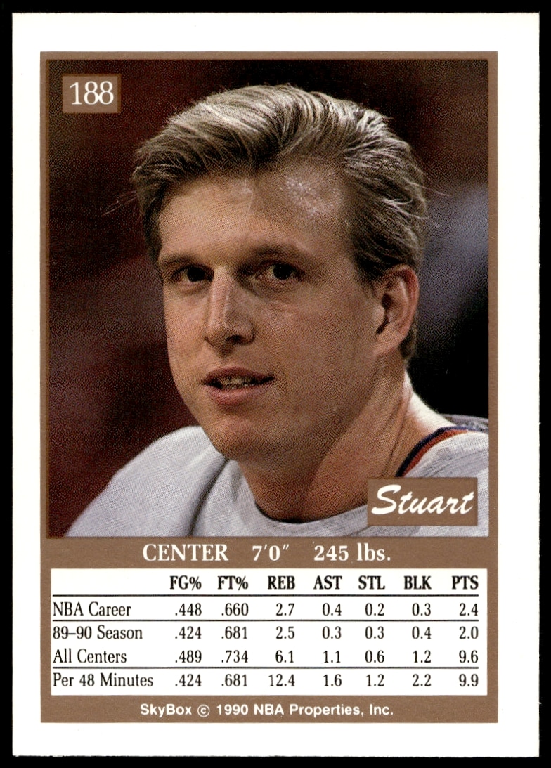 This Basketball card, from 1990-91 is part of the SkyBox card set. Stuart Gray is featured and has a card number of 188.
