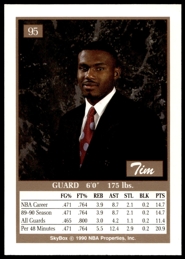 This Basketball card, from 1990-91 is part of the SkyBox card set. Tim Hardaway is featured and has a card number of 95.