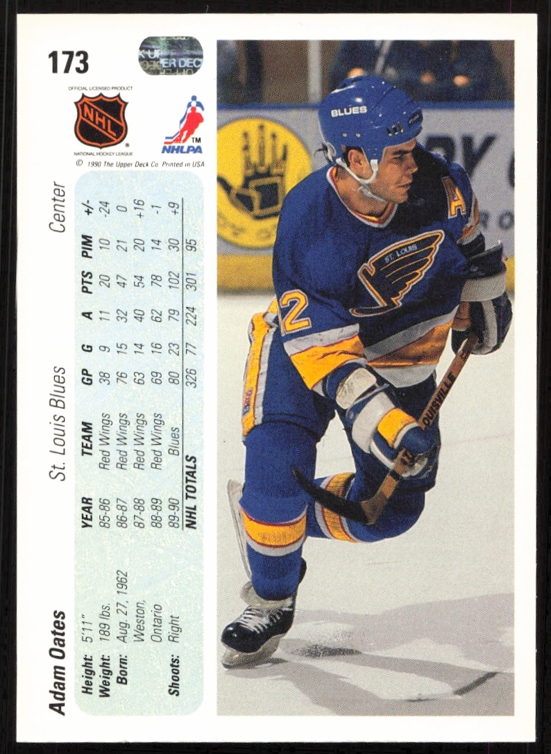 This Hockey card, from 1990-91 is part of the Upper Deck card set. Adam Oates is featured and has a card number of 173.