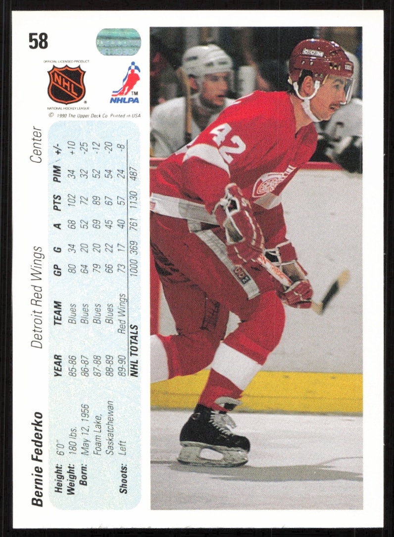This Hockey card, from 1990-91 is part of the Upper Deck card set. Bernie Federko is featured and has a card number of 58.