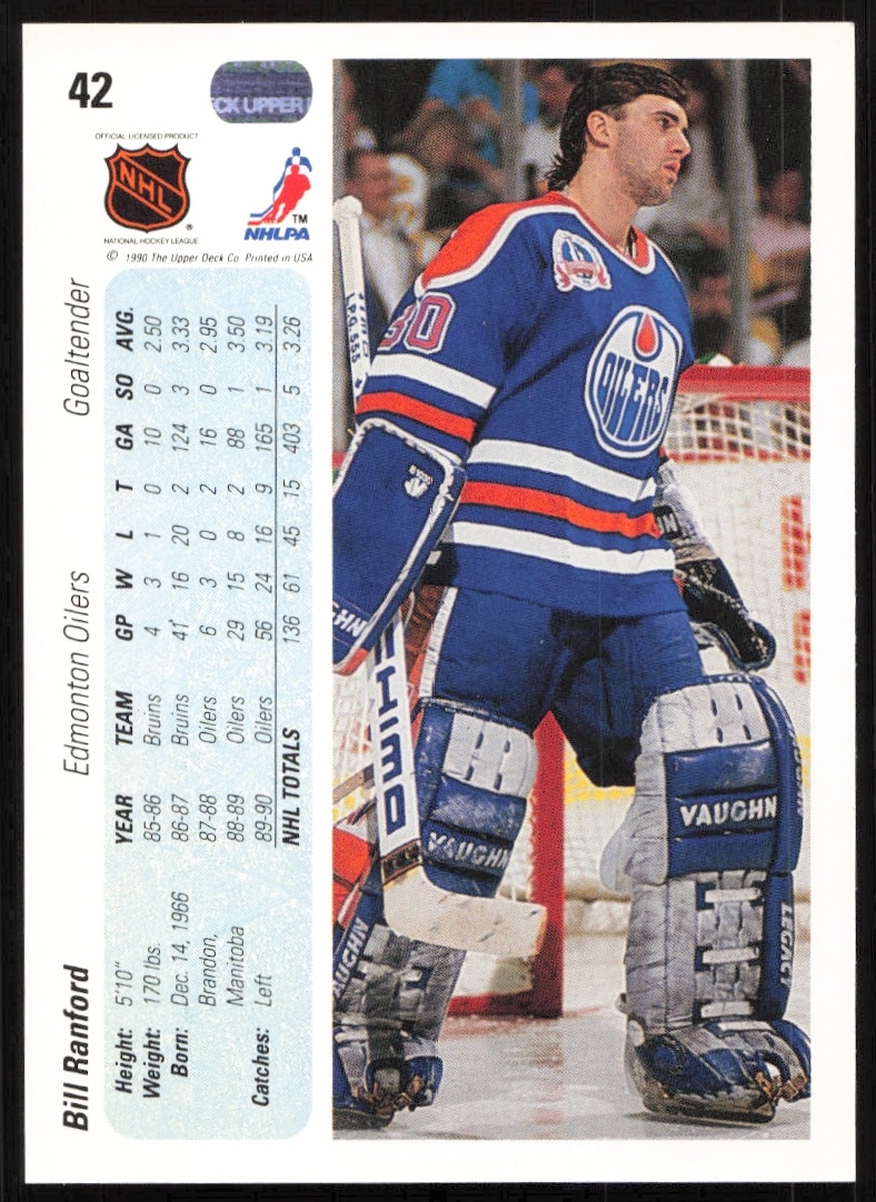 This Hockey card, from 1990-91 is part of the Upper Deck card set. Bill Ranford is featured and has a card number of 42.