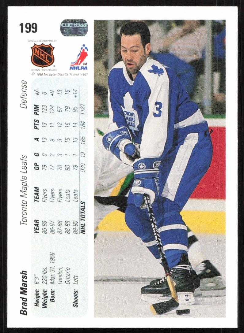 This Hockey card, from 1990-91 is part of the Upper Deck card set. Brad Marsh is featured and has a card number of 199.