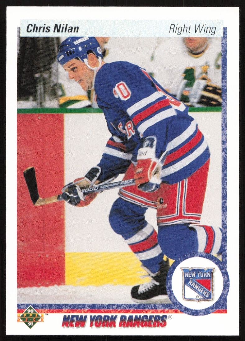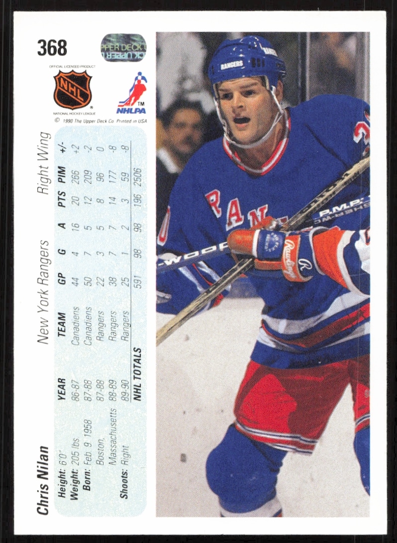 This Hockey card, from 1990-91 is part of the Upper Deck card set. Chris Nilan is featured and has a card number of 368.