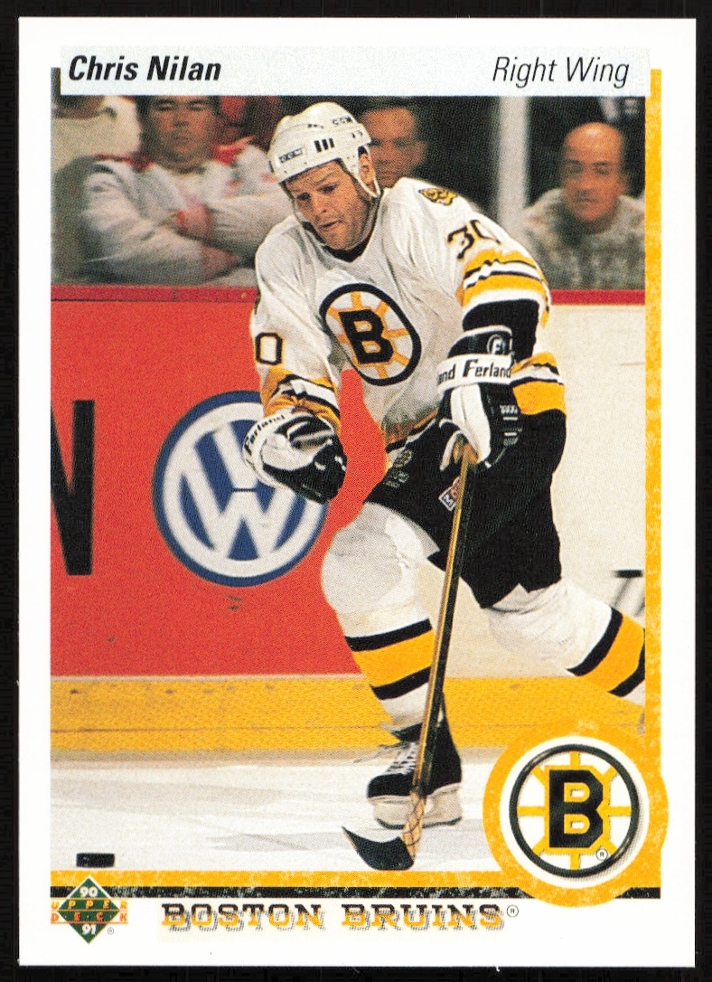 This Hockey card, from 1990-91 is part of the Upper Deck card set. Chris Nilan is featured and has a card number of 442.