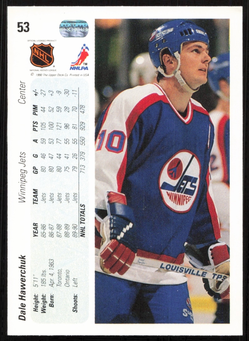 This Hockey card, from 1990-91 is part of the Upper Deck card set. Dale Hawerchuk is featured and has a card number of 53.