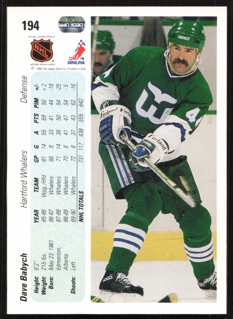 This Hockey card, from 1990-91 is part of the Upper Deck card set. Dave Babych is featured and has a card number of 194.
